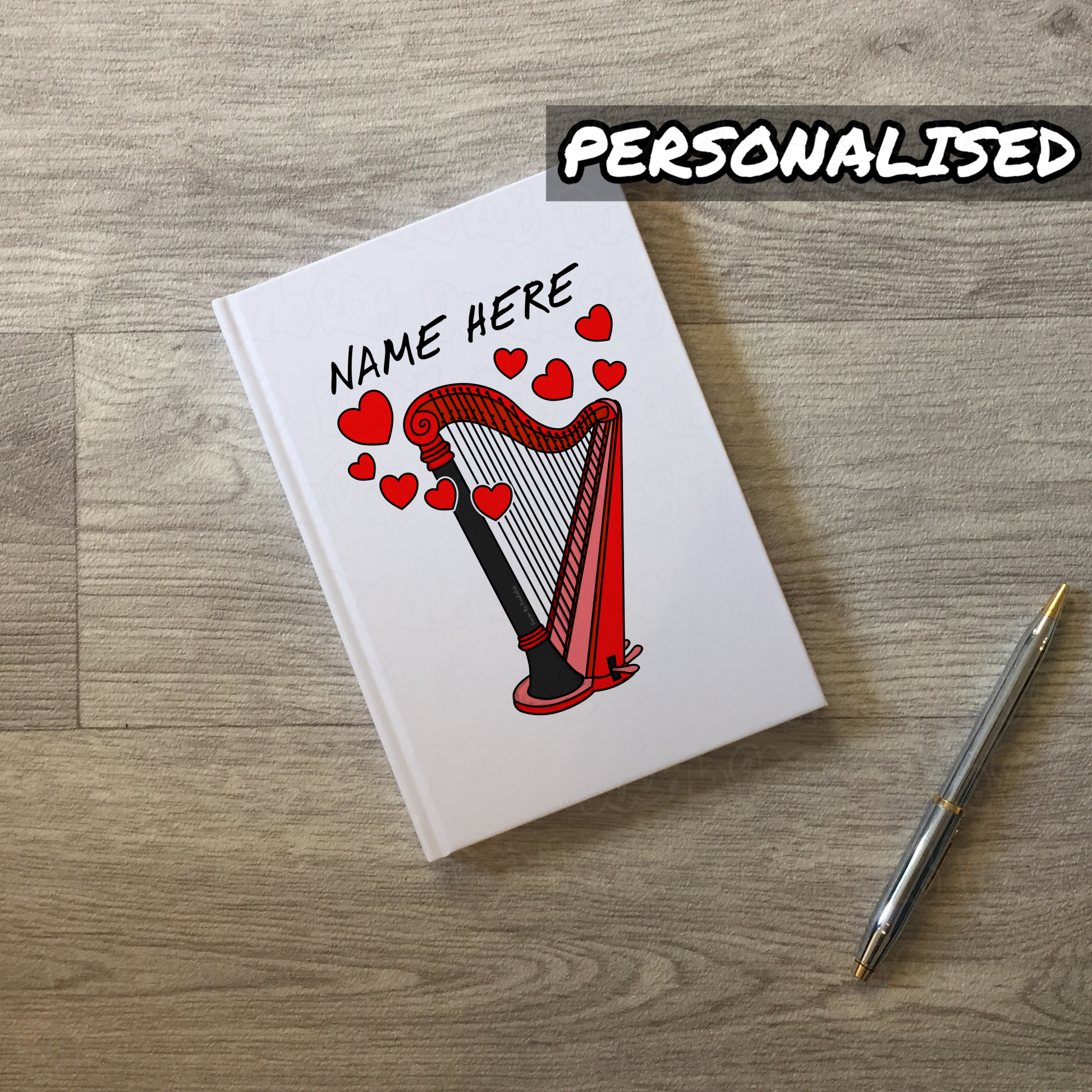 Harp Personalised Journal (Hearts) - Wedding Harpist Notebook - String Musician Valentines Gift
