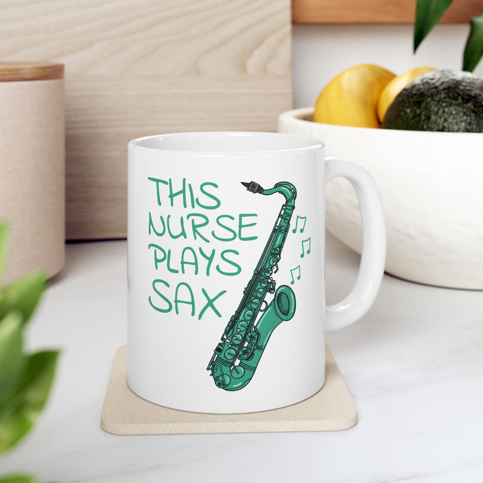 This nurse saxophone mug features my doodle of a saxophone with the text, "This Nurse Plays Sax"! The ideal gift for a nurse who plays saxophone!